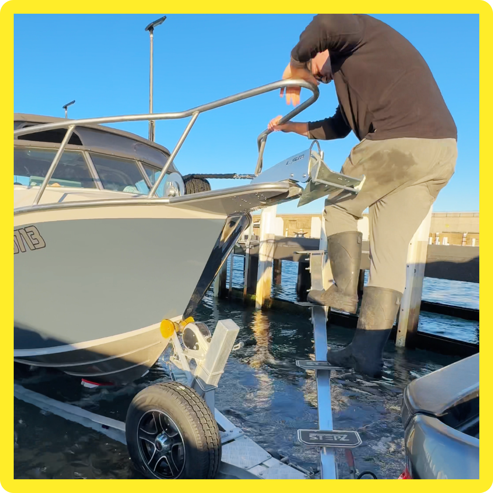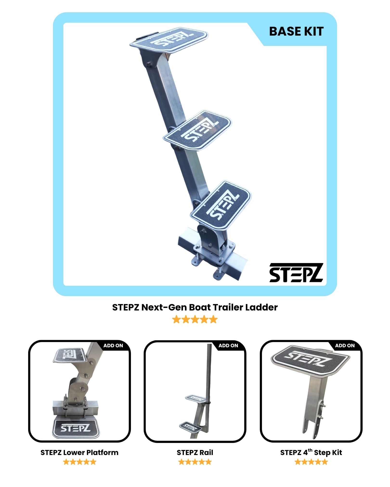 STEPZ is a bolt on trailer ladder that makes getting in and out of your boat easier, fits most trailers, and installs with basic tools.